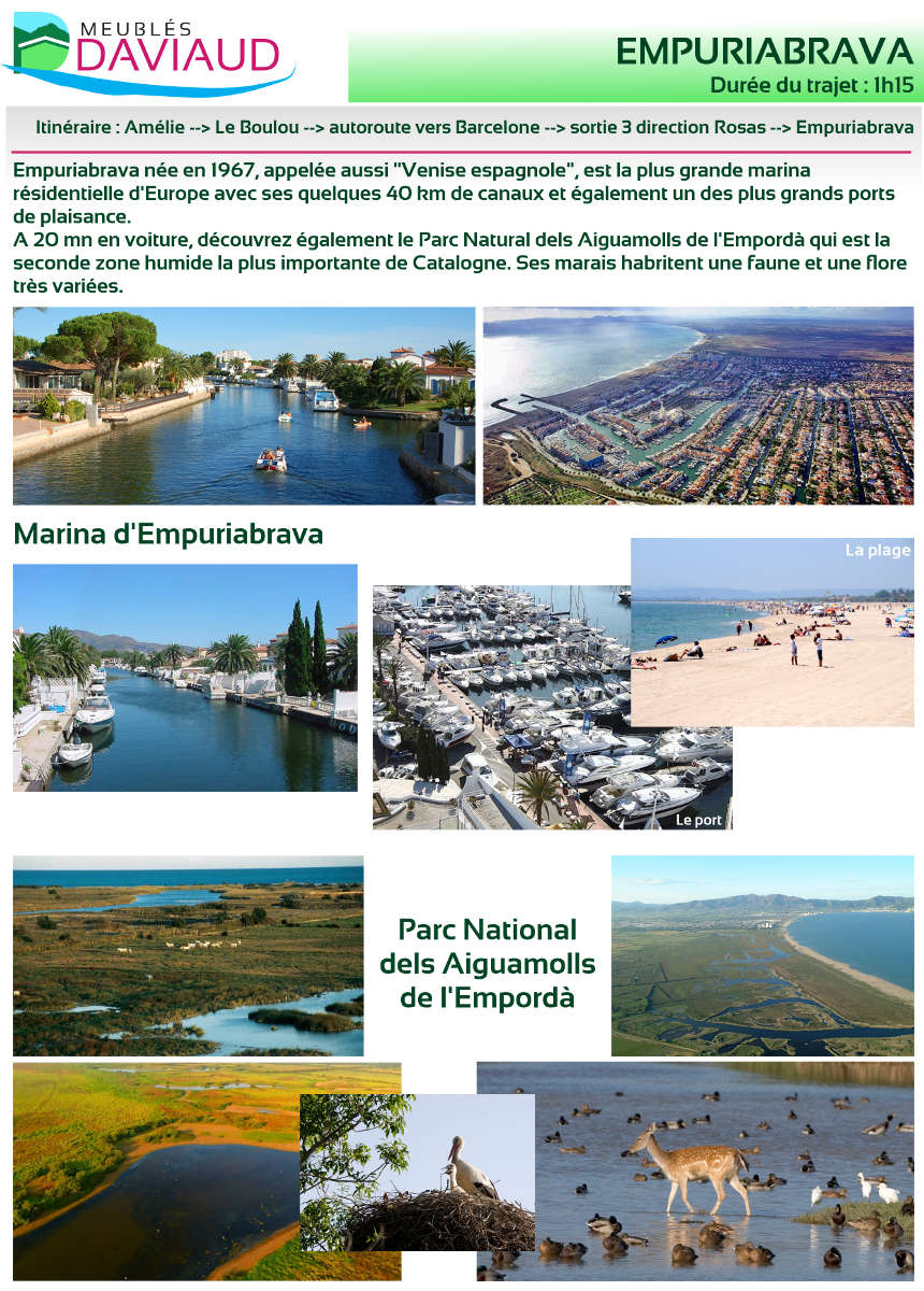 | 1 H 15 mn | Empuriabrava | Webcam | Venise espagnole, Plus grande marina d'Europe, Canaux, Port de plaisance, Parc natural dels Aiguamolls de l'Empordà, Marais, Faune, Flore, Plage, Shopping. |